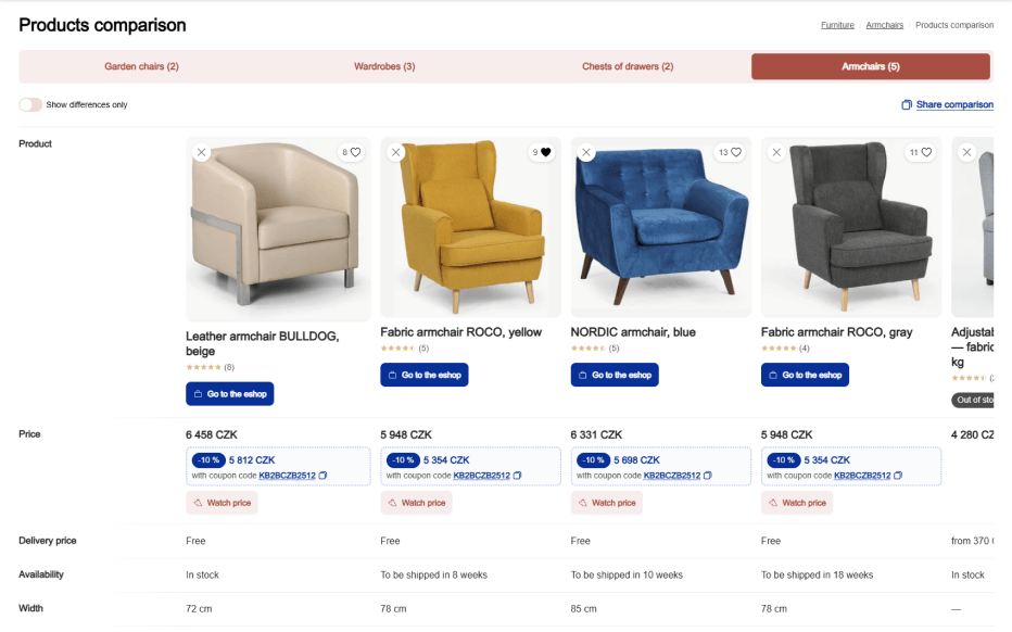 Su ogni prodotto troverai un'icona di confronto, sia negli elenchi che nei dettagli. Con un clic, aggiungi il prodotto a una tabella di confronto dove potrai vedere le foto, i prezzi e tutti i parametri importanti ben affiancati. Mancano dei dati? La nostra IA li inserirà dalla descrizione del prodotto. Puoi nascondere i parametri che sono uguali per tutti i prodotti e concentrarti solo sulle loro differenze. I prodotti sono automaticamente suddivisi per categorie, quindi confronterai solo ciò che ha senso. E quando trovi un confronto interessante, puoi condividerlo facilmente con qualcuno tramite un link. Stai navigando tra più prodotti della stessa categoria? Ti offriremo automaticamente il loro confronto. Sotto la tabella di confronto, troverai i prodotti consigliati che puoi aggiungere facilmente. Il tuo confronto rimane salvato anche dopo aver chiuso la finestra.